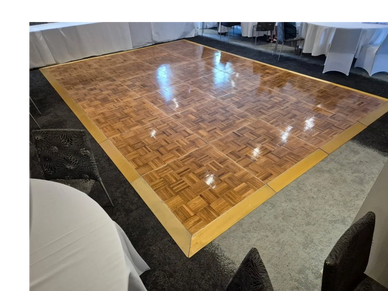 Parquetry dance floor with gold edging.
